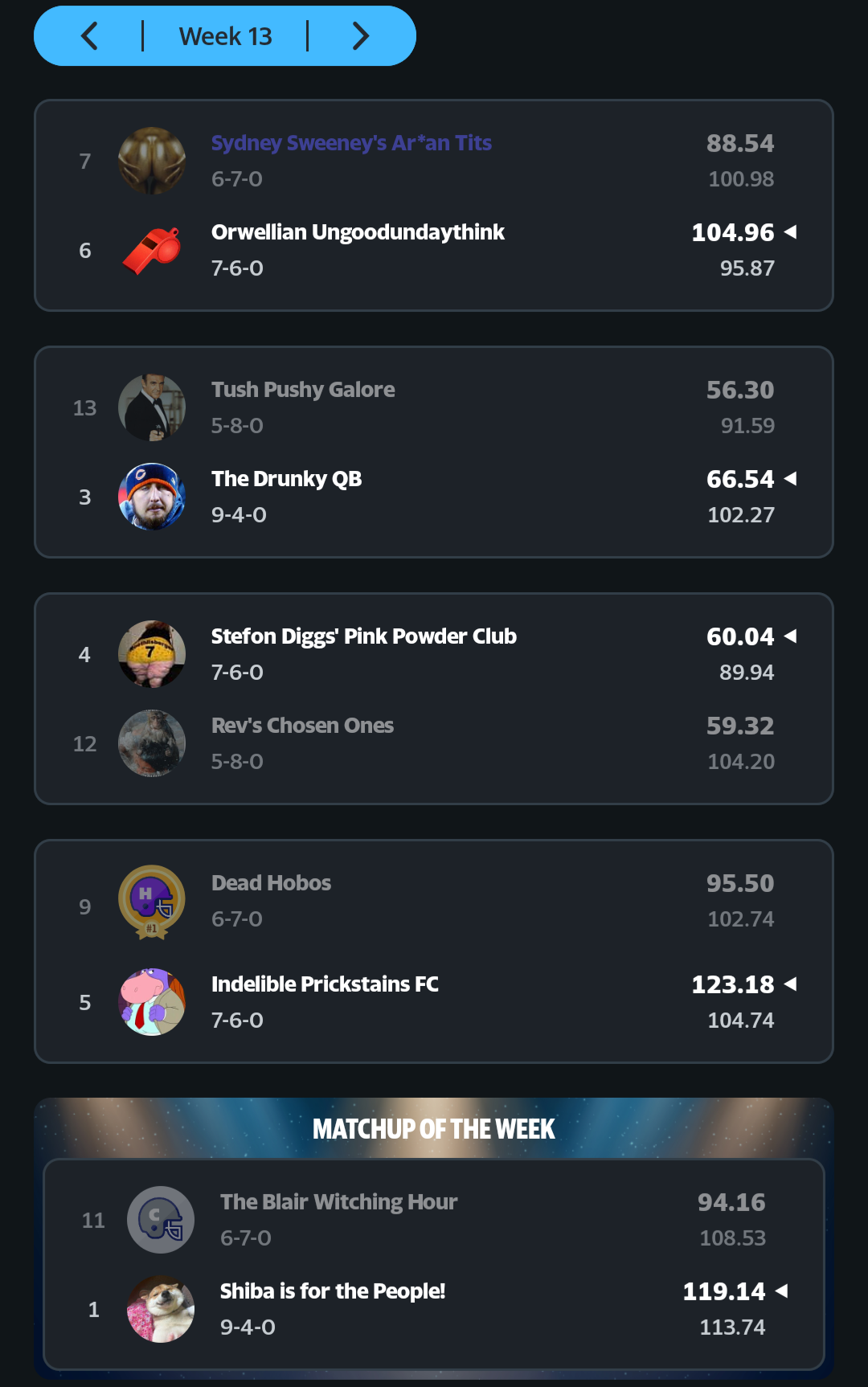 What’s changed since last week, you ask? For starters, Shiba is for the People! has taken the top spot from Original Recipe White Claws via tiebreaker. The Drunky QB sits in third, though technically tied with the top two teams at 9-4. Rounding out the playoff tier this week at 7-6, we have Stefon DIggs’ Pink Powder Club, Indelible Prickstains FC, and Orwellian Ungoodundaythink. This next bunch may or may not make the playoffs, but they are in the quasi-Jeff Fisher Zone with 6-7 records. Bonus! One of these teams will most likely face relegation soon. D&D For Jocks, Dead Hobos, Pump Up The Spam, and The Blair Witching Hour still have something to fight for. The same can’t be said for these last three teams; Rev’s Chosen Ones (5-8), Tush Pushy Galore (5-8) and She’s got good Jeantys (3-10) look to be assured of relegation this season.