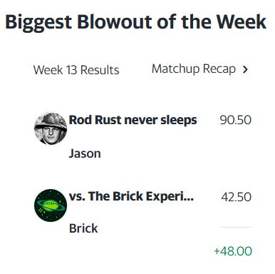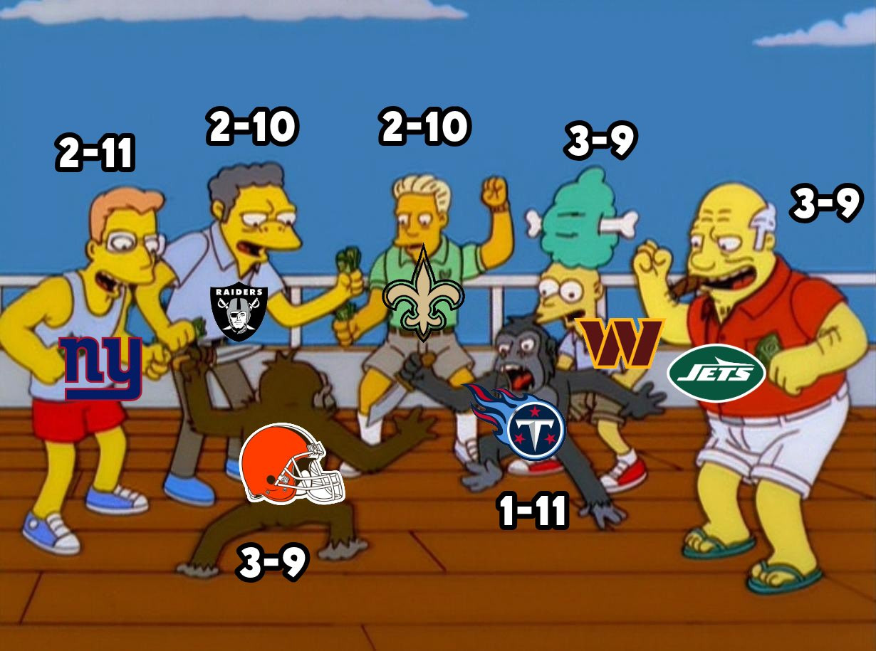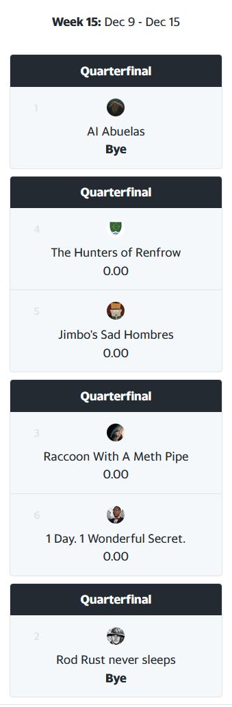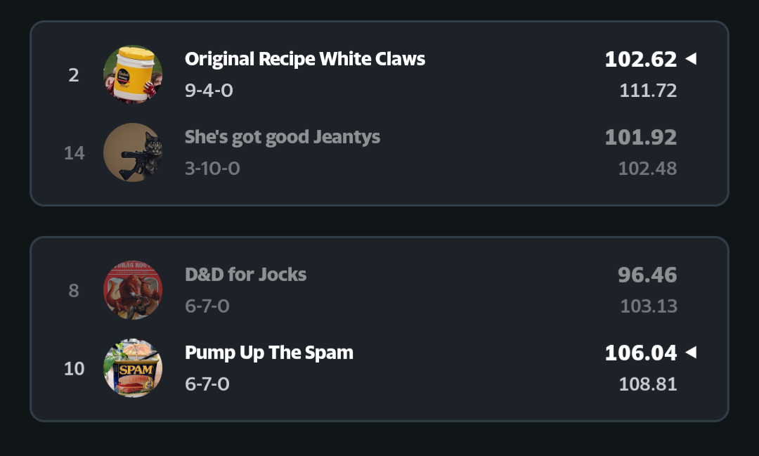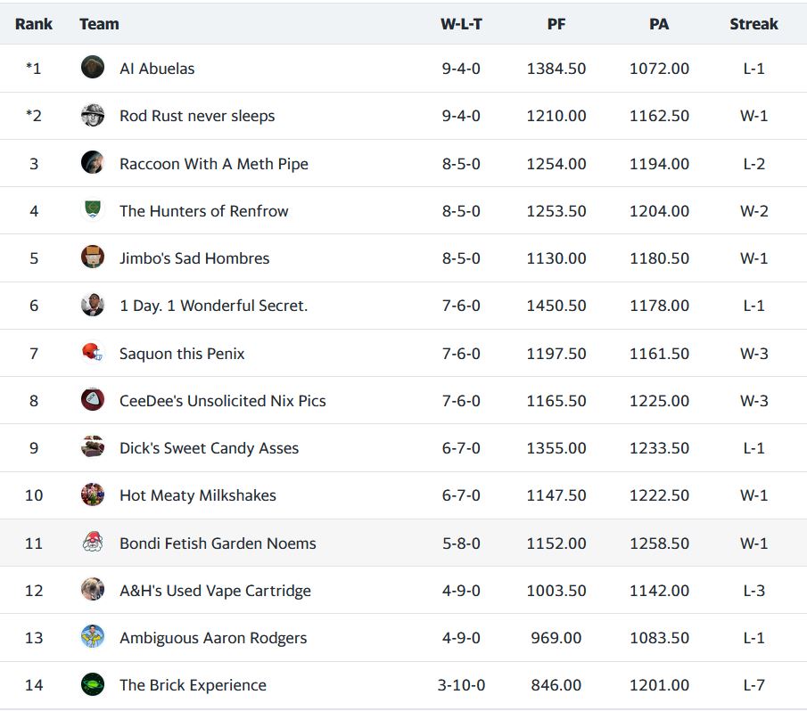 AI Abuelas is still the gold standard in Lowratio League, even with a defeat this past week. Rod Rust never sleeps joins them in clinching a playoff berth, both teams with 9-4 records. As it stands, these two teams would have the first round byes. Mazeltov! At 8-5, Raccoon With A Meth Pipe slips down into the third spot, still in playoff contention, along with The Hunters of Renfrow and Jimbo’s Sad Hombres also at 8-5. That leaves one playoff spot up for grabs with three teams vying for it, all at 7-6; 1 Day. 1 Wonderful Secret. Saquon this Penix, and CeeDee’s Unsolicited Nix Pics. On the outside looking in with 6-7 records we have Dick’s Sweet Candy Asses and Hot Meaty Milkshakes. On the outside and looking at hopping a freight train to warmer climes is Bondi Fetish Garden Noems at 5-8. That leaves three teams in Lowratio’s Paddock; A&H’s Used Vape Cartridge (4-9), Ambigious Aaron Rodgers (4-9) and The Brick Experience (3-10).
