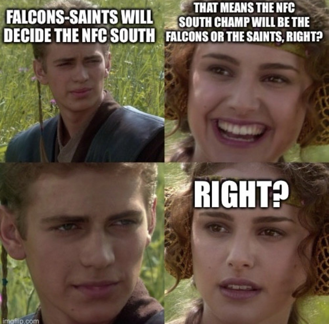 If Atlanta takes it Carolina backs in to the playoffs. If New Orleans takes it Tampa backs in to the playoffs. I Can’t Stop Chewing My Nails!