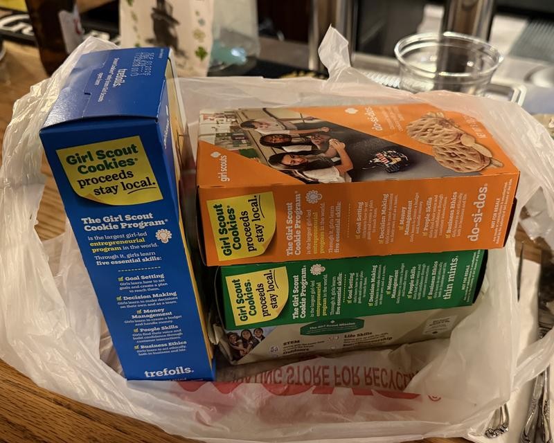 Here’s a haul of Girl Scout cookies someone just gave me: Trefoils, Do-Si-Dos, Thin Mints, &