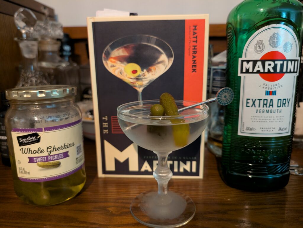 Anyway this week I wanted to keep on the martini trend, because they are delicious and I’m always looking out for a new variant. What I’m trying this week is the Pickled Martini from my Martini cocktail book. It features cornichon garnish as well as use of the brine. That immediately intrigued me because I can see how that would go very well together, and create kind of an alternative dirty martini for me, since I do not like olives. However I have a slight problem. I only have sweet gherkins on hand. I know essentially all cornichons are gherkins, but not all gherkins are cornichons, but I’m slightly concerned the sweeter brine wont play as well. Though I figured it was still worth attempting to make with these, so I can rate how they compare to the real ones I’ll plan on making eventually.