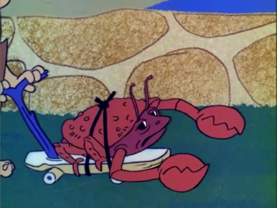 Does the crab look at the camera sadly and say “It’s a living” or is this the one and only time where this hackneyed trope is not used?