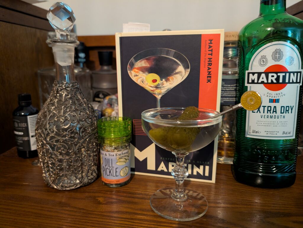 What does this have to do with the drink of the week? Well, nothing really. I’m kind of being a little lazy this week. I’m trying the pickle martini from last week, but with a twist. When unpacking a random bag from Christmas, I found some dill pickle salt I was given and I figured I would try to top the same drink with some of the pickle salt, to add some salt and brine flavor to the one i tried last week.