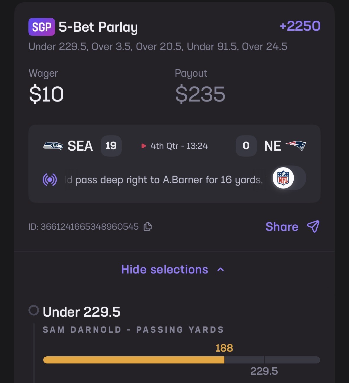 -I’d look for a few long passes outside the numbers to JSN in order to try and break the game open for Seattle. If Maye can get the time, look for the same to Boutte, who seems to be the Pats only speedster.