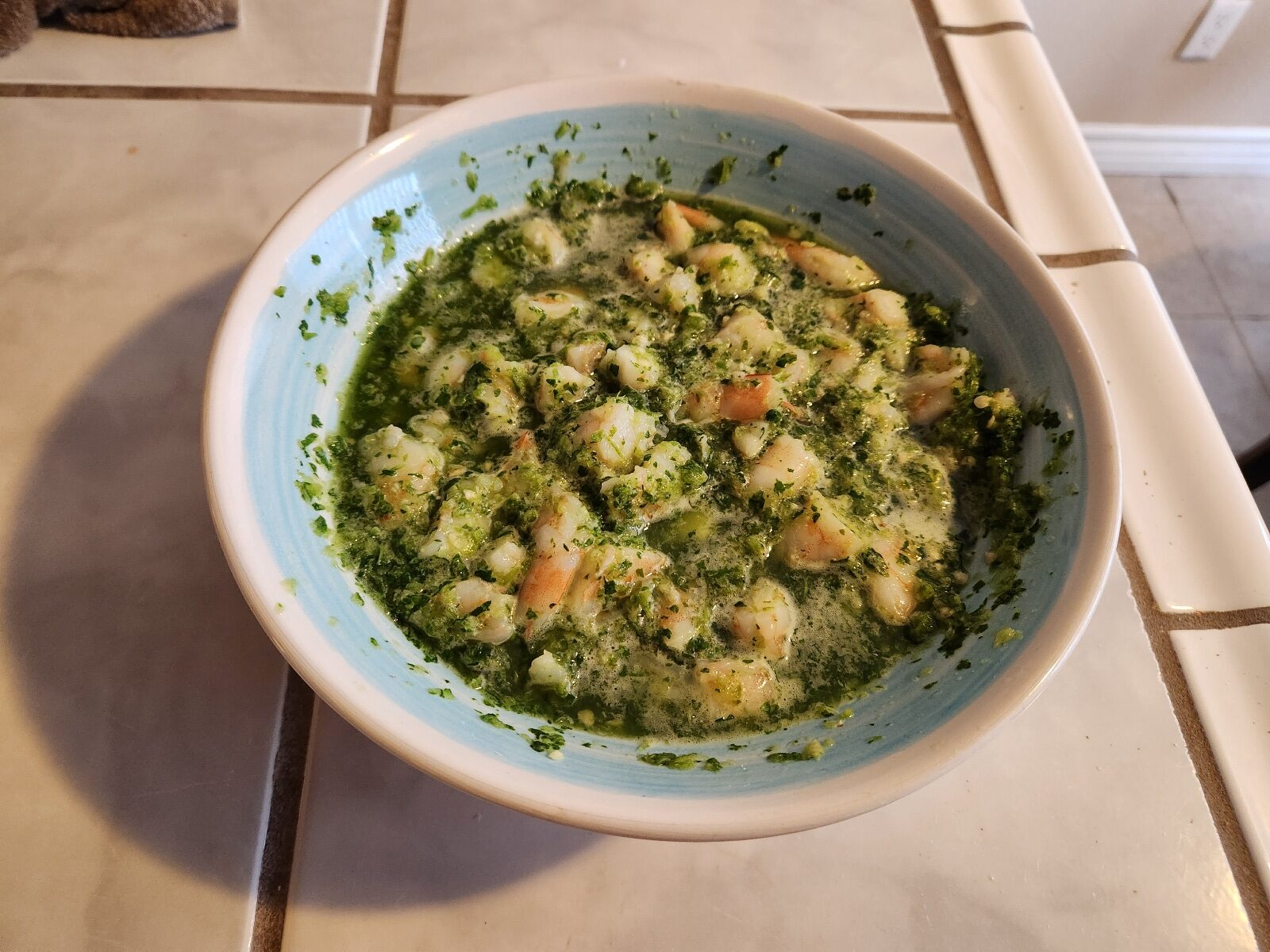 Pour the cilantro, chili, lime goo over the shrimp and refrigerate for about 20-30 minutes.