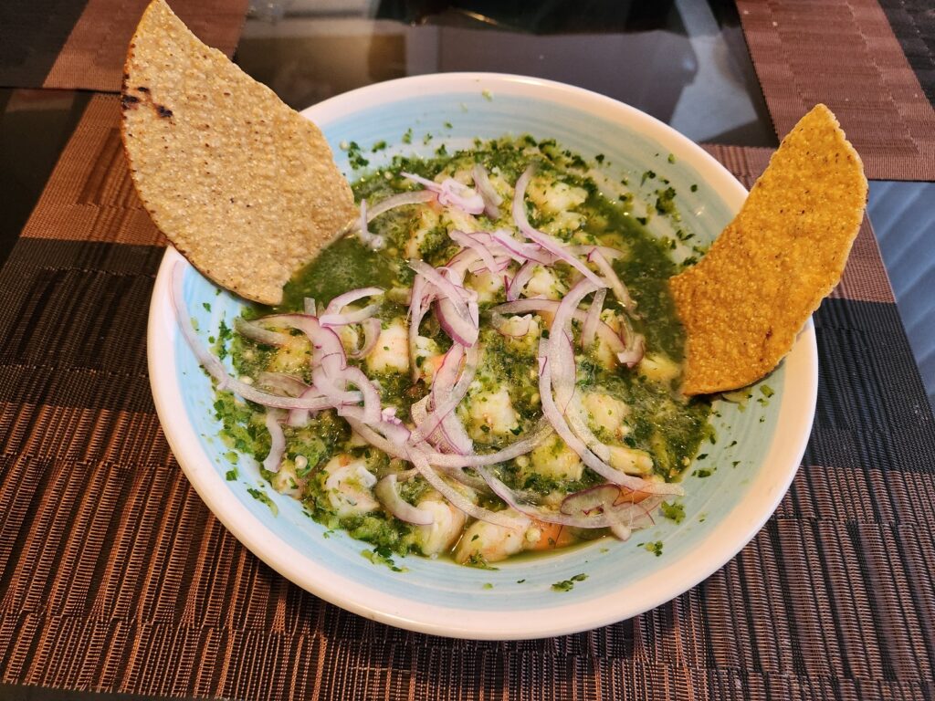Aguachile is literally named “Chili Water.” Same preparation as a ceviche where seafood – shrimp in this case – is “cooked” in lime juice, mixed with onion, cilantro, chilies and such then served cold and fresh with tortilla chips.