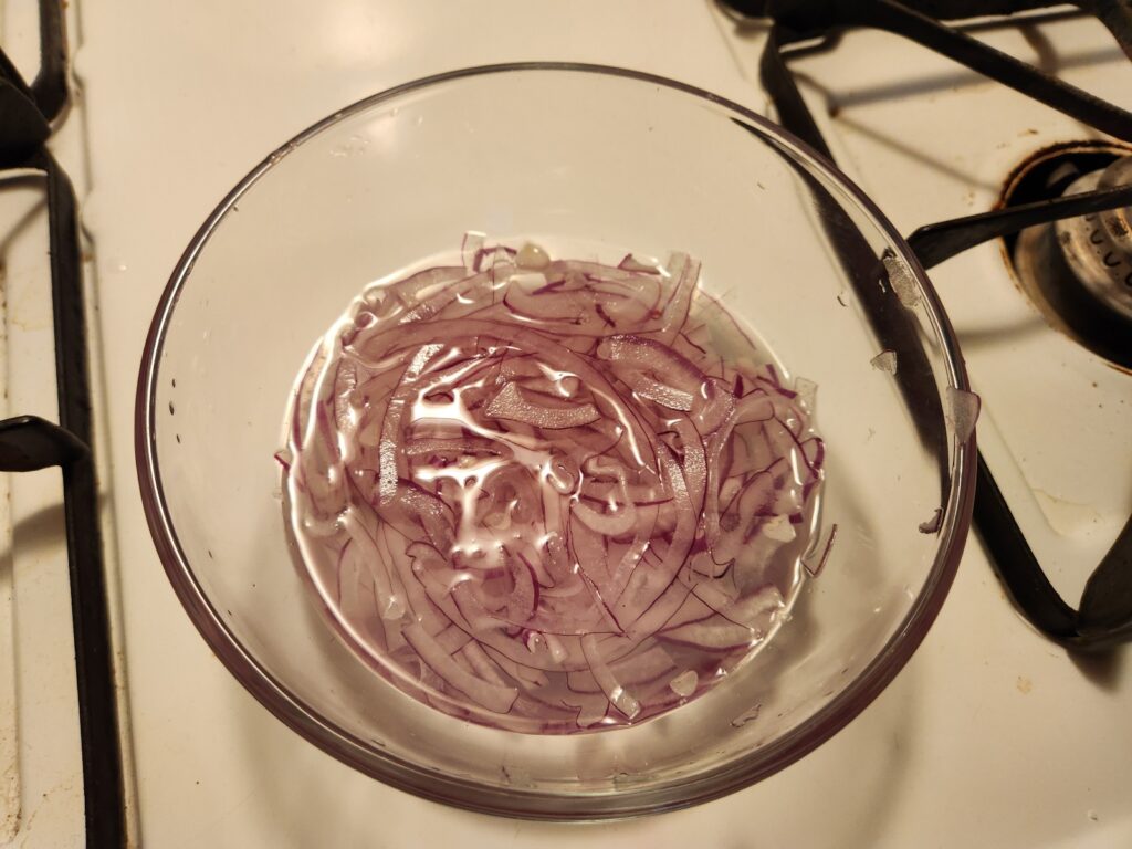 Give the onion a quick pickle with the water and white vinegar.