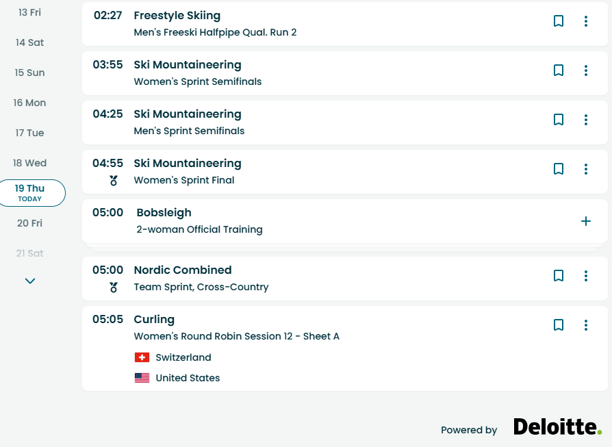 I suppose there will be other stuff happening, but the website won’t tell me what any of it is past 5:05 a.m., or even what time zone the listings refer to. Is that Eastern Standard Time? Pacific? Local Milano/Cortina time? Who the hell knows, it’s not labeled anywhere. One would presume it’s local time since it lists Thursday as “today” (I’m writing this up on Wednesday evening), but I have a hard time believing that the Men’s Freestyle Skiing Halfpipe Qualifying Run 2 starts at 2:27 in the morning.  Thanks a lot, Deloitte! Sure earned your paycheck on this one.