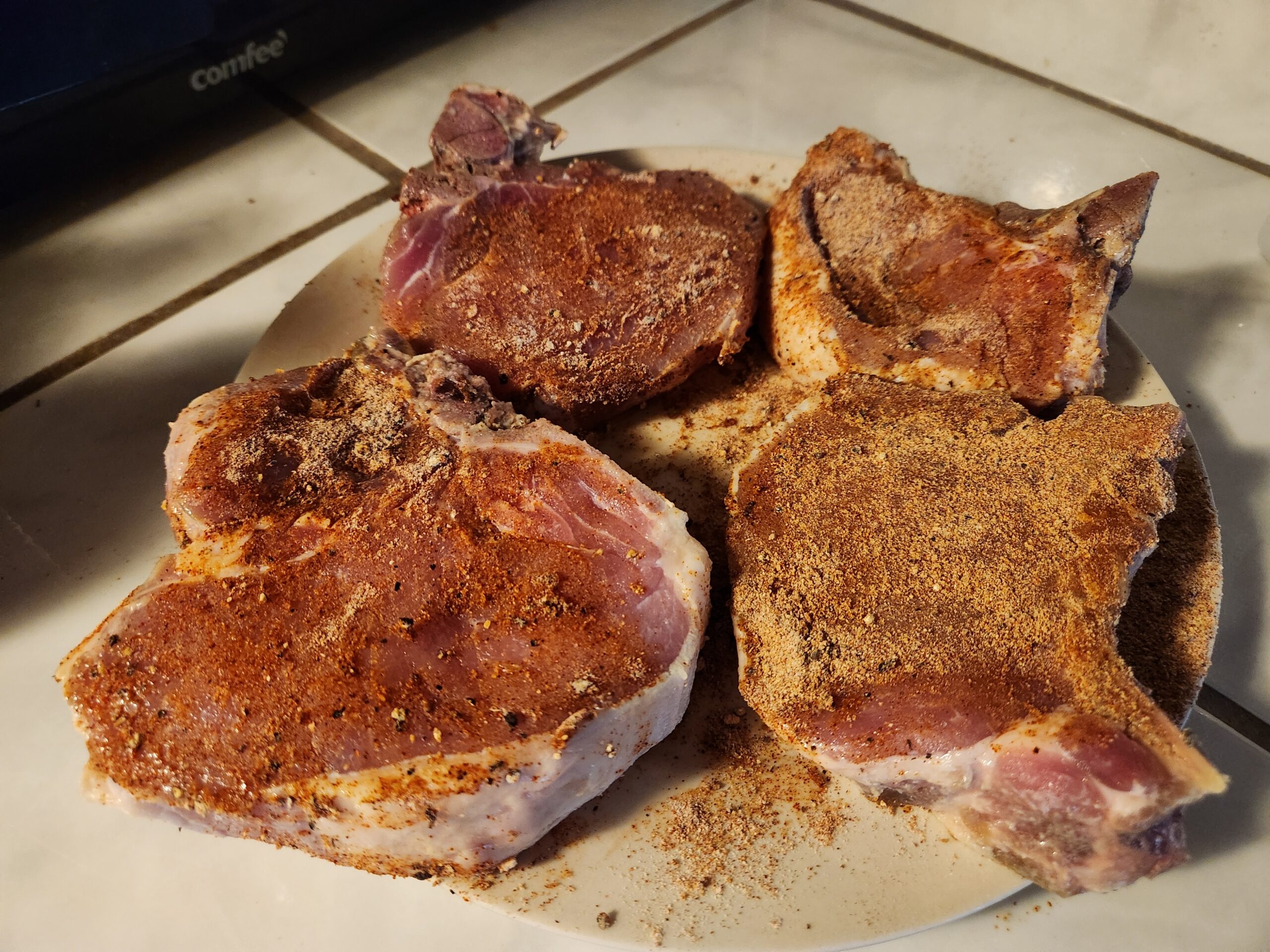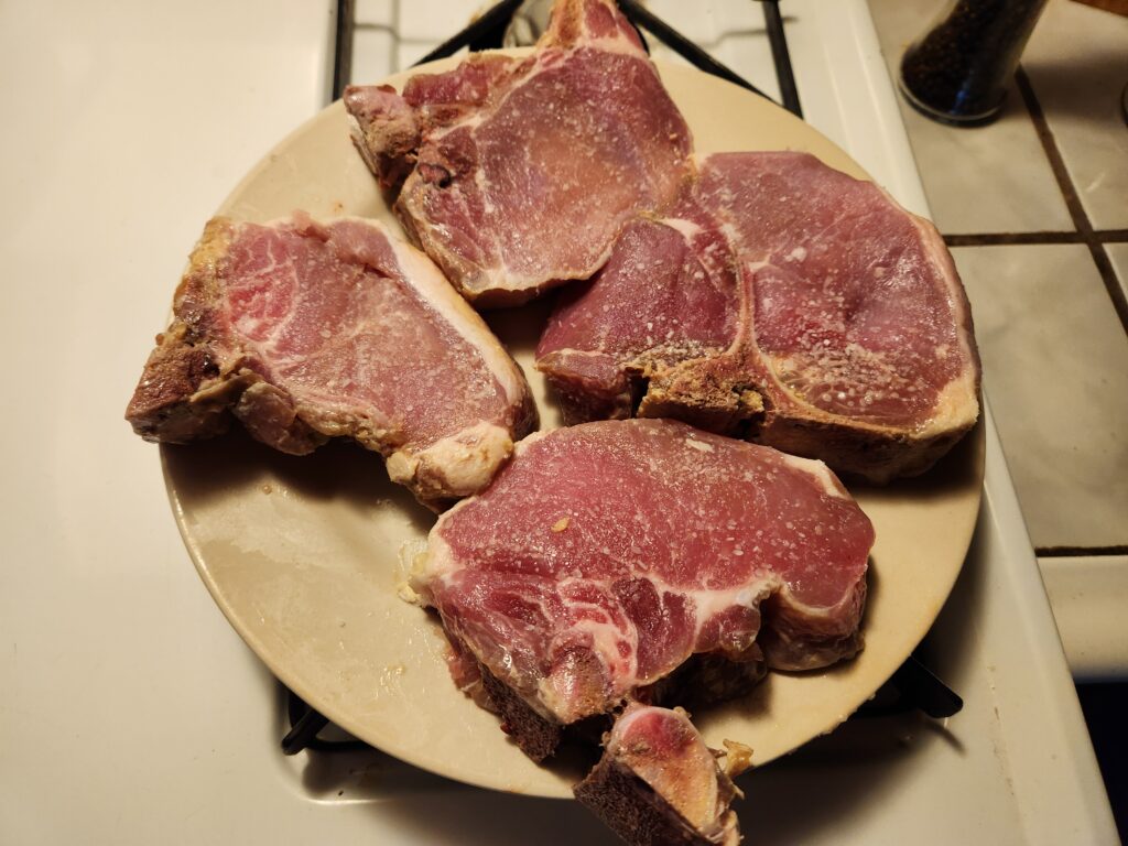 Let the pork get up to room temperature then rinse the chops, pat dry with a paper towel and salt both sides.