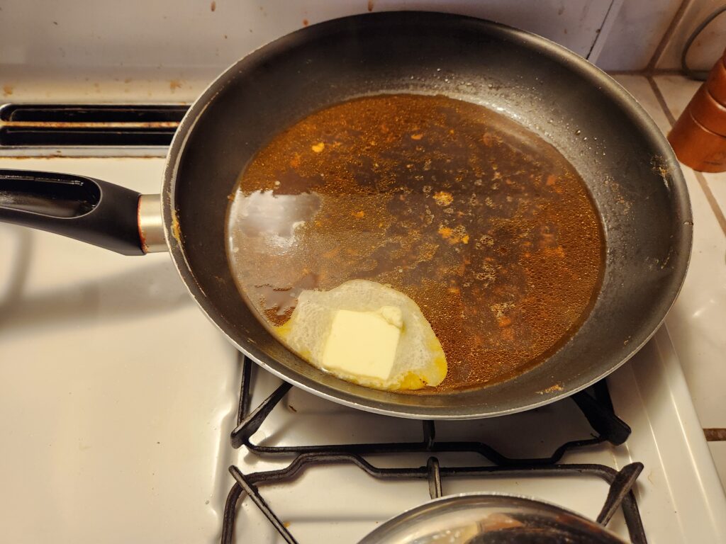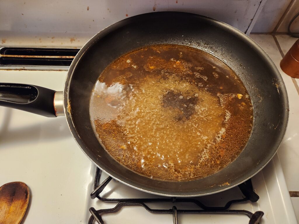 Honey, apple cider vinegar and the chicken stock goes in the pan. Scrape up the meaty bits on the bottom of the pan.