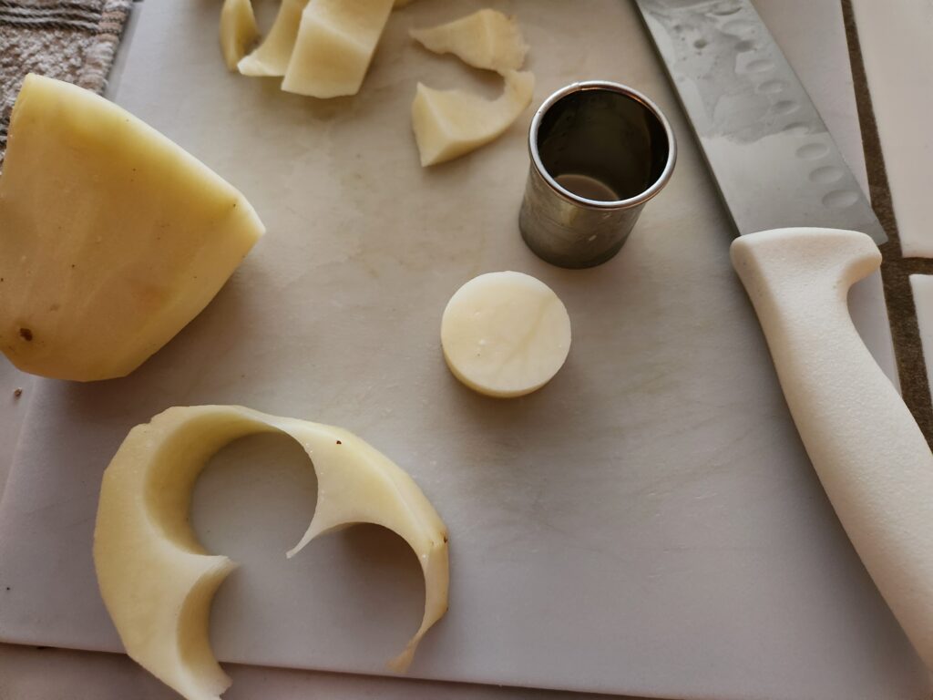 Using my handy biscuit cutter I cut out the potato “disks.”