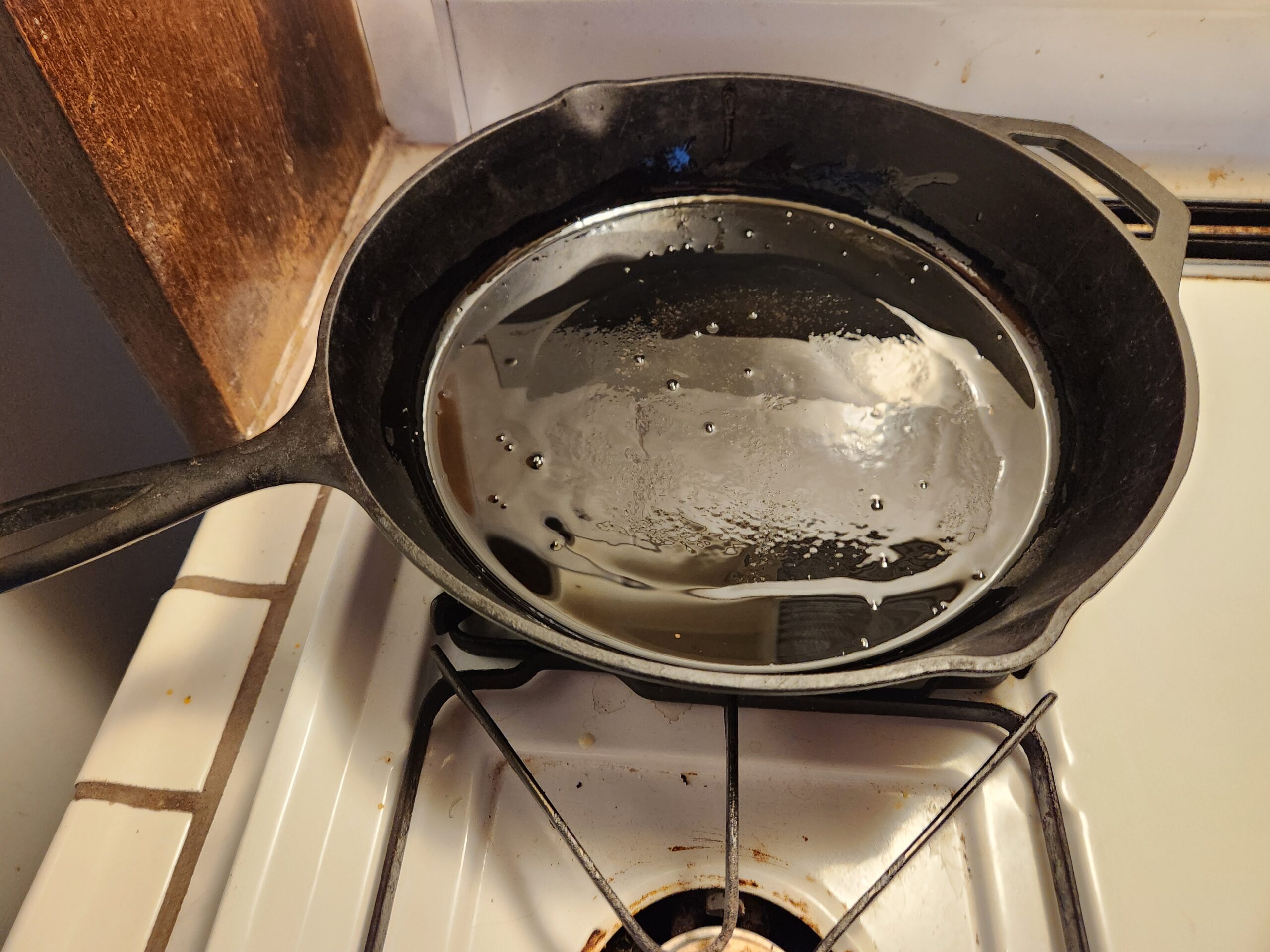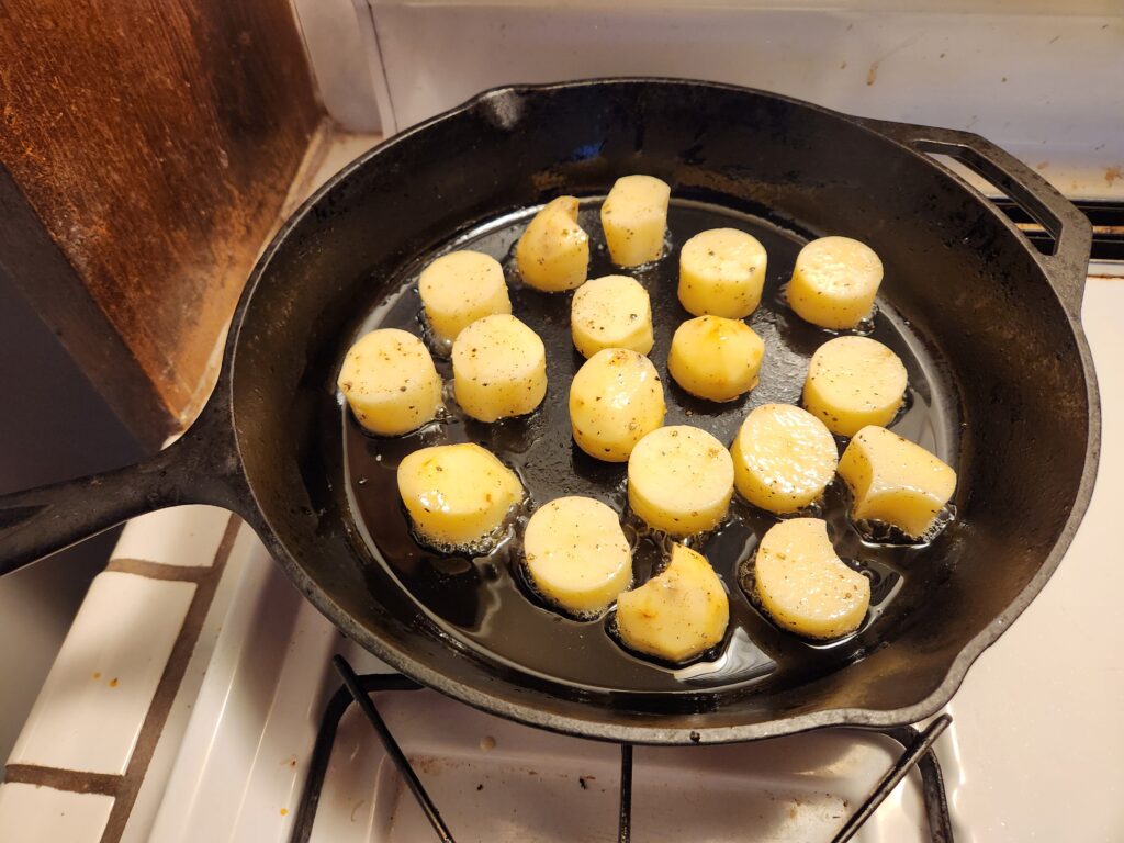 Heat up your cast iron skillet. The cast iron is key here because you really want that crispy surface on the potatoes. It’s everything.