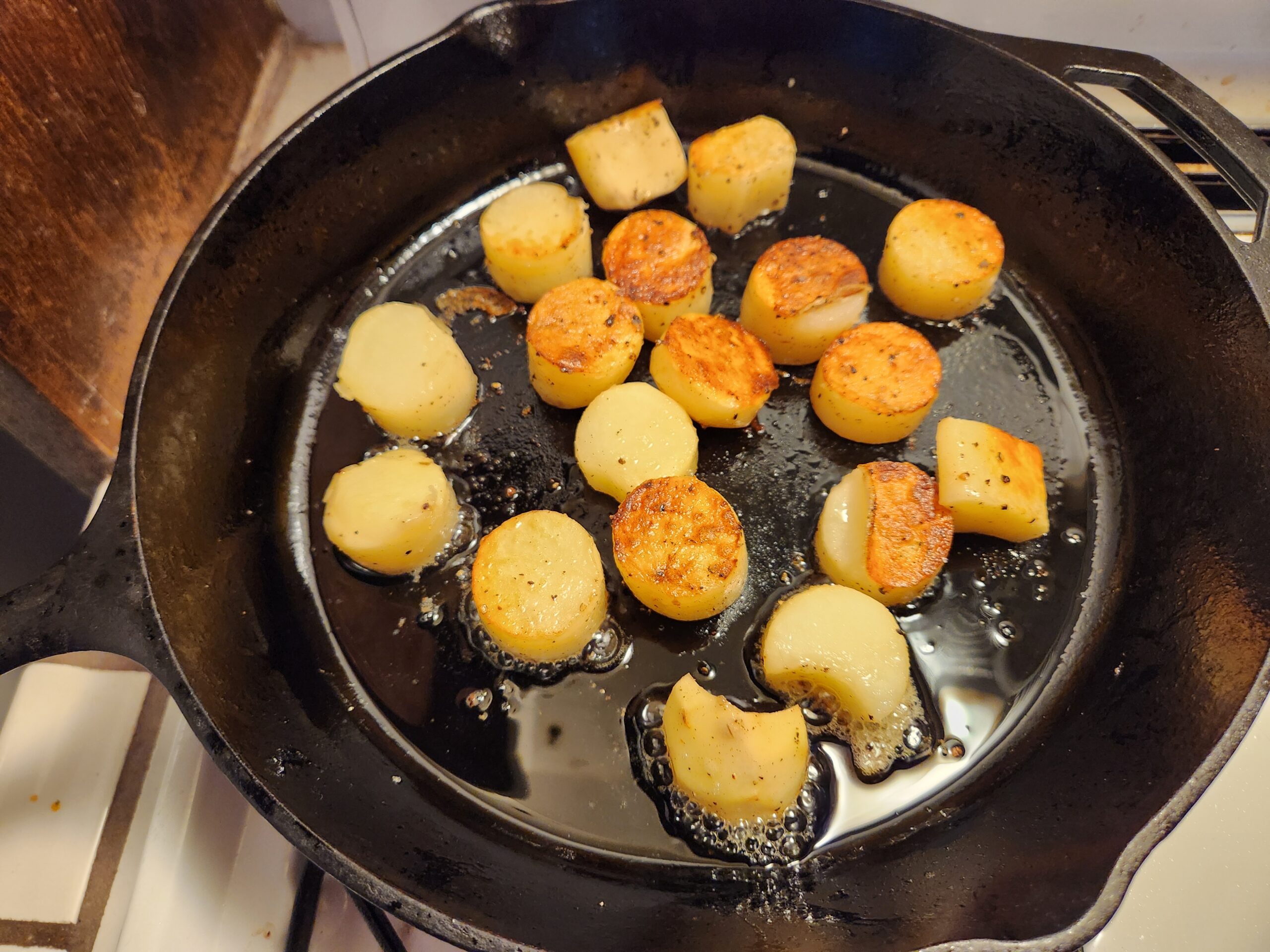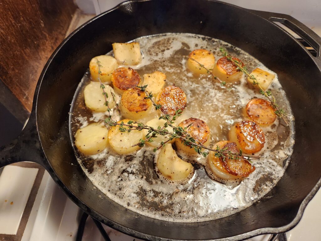 Baste the potatoes then toss their ass into a 375 oven for 30 minutes. Right there in the cast iron. That’s what’s so goddamn cool about using cast iron.