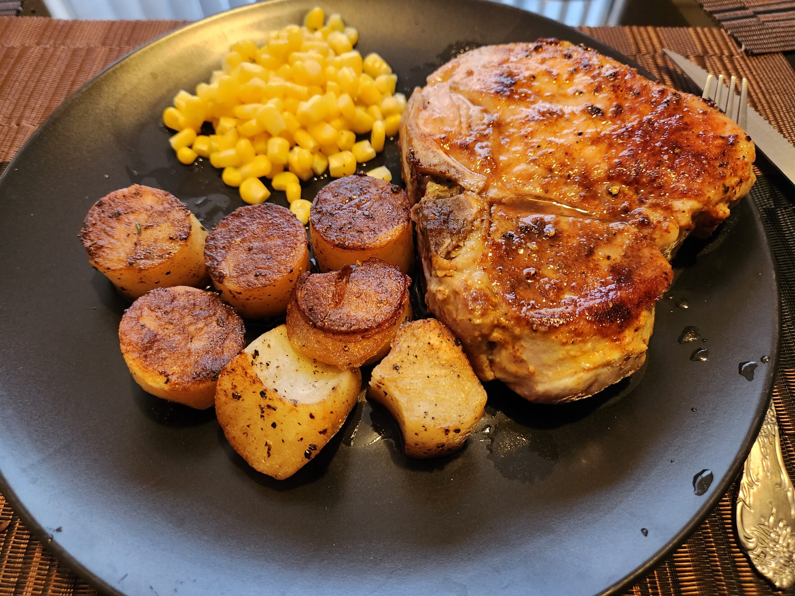 That pork chop is fucking EXCELLENT. Love the tang of the vinegar and the bit of sweetness from the honey. Just quality, quality shit.