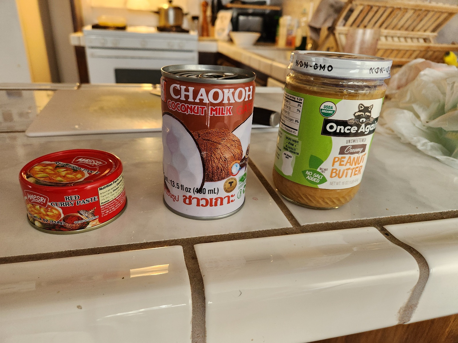 Not sure how your local grocery store handles Asian style foods but I can usually find coconut milk at my regular Ralph’s and I can sometimes find red curry paste and I’m sure EVERYONE can find natural peanut butter.