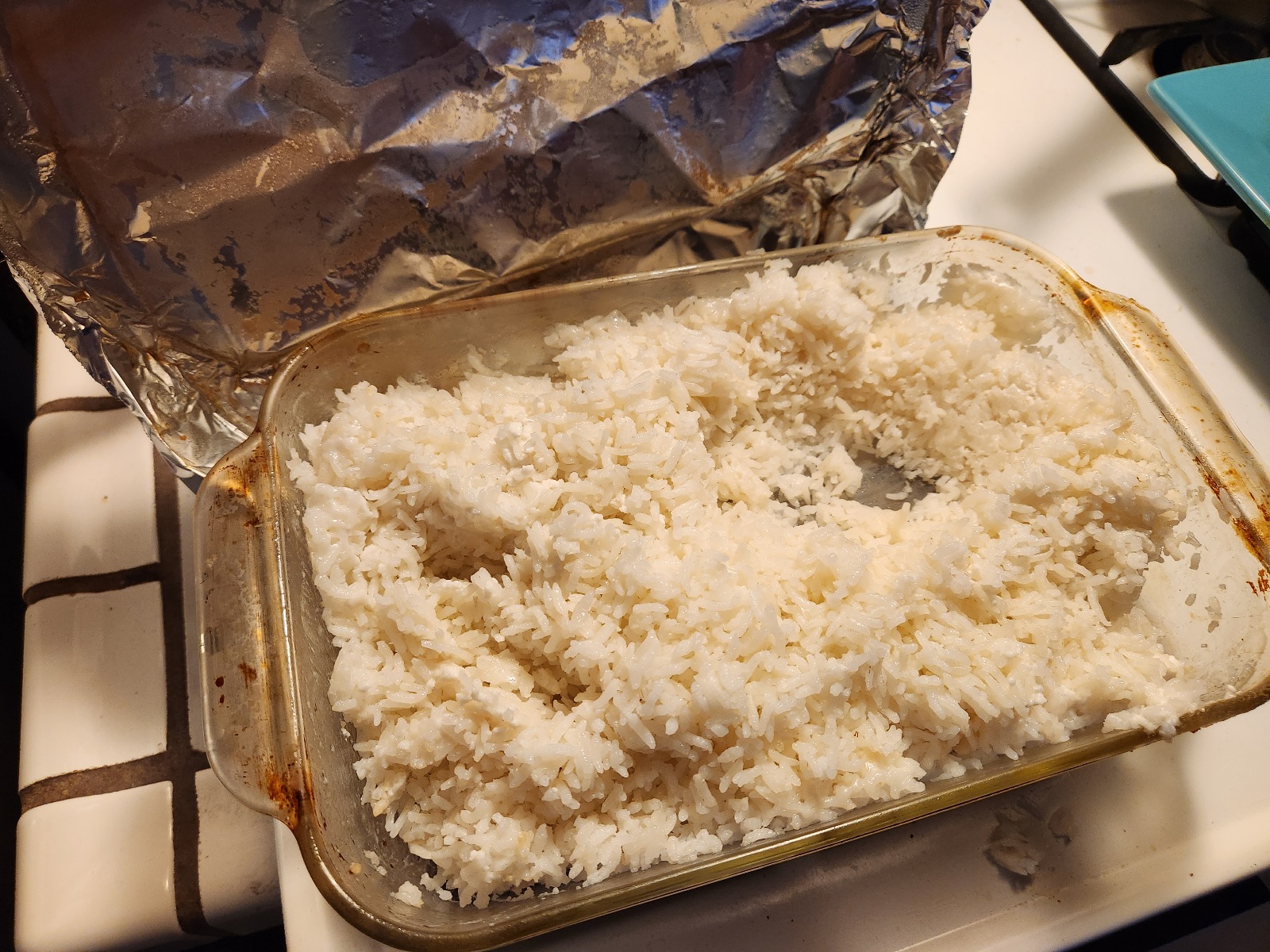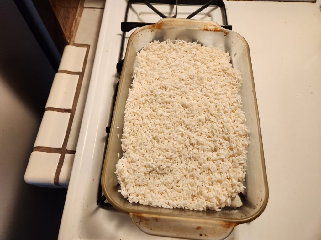 The rice has finally finished its 40 minute long sauna, so drag that shit out of the oven.