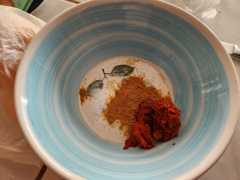 Add the salt, sugar, curry powder and curry paste to a bowl.