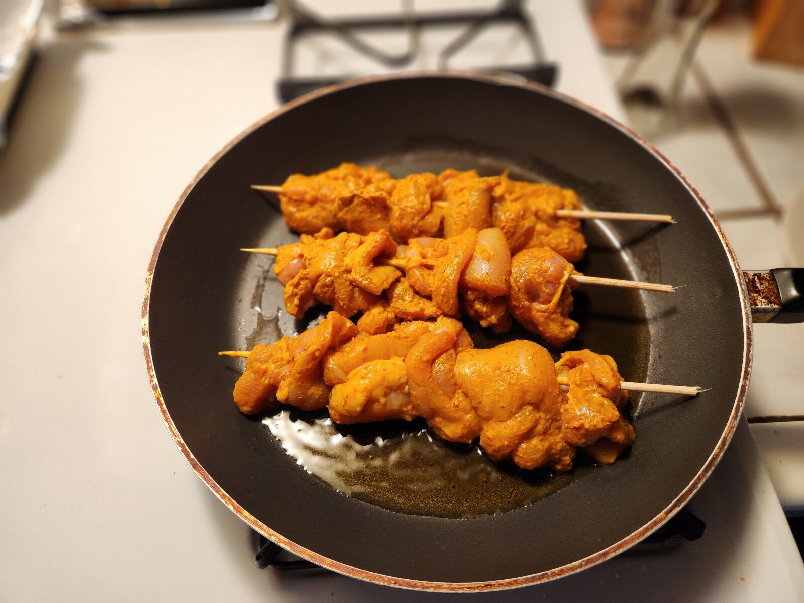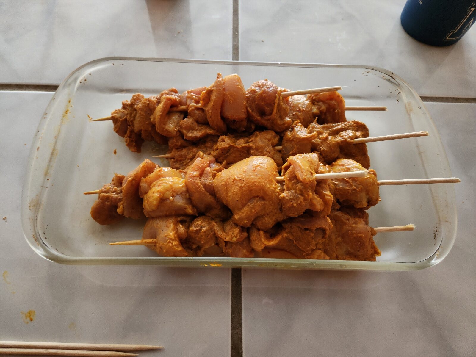 Skewer up the marinated chicken.