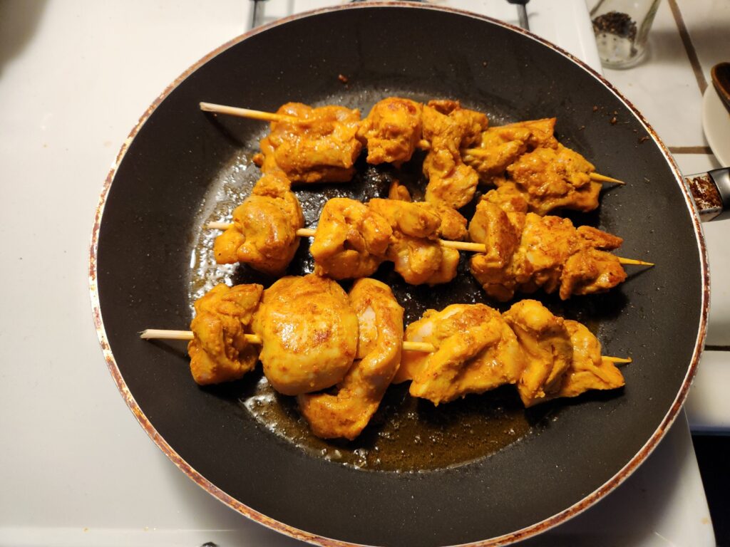 Next day, soak the skewers several hours ahead of time. These are made from bamboo afterall. This would be especially key if you’re cooking the chicken on a grill.