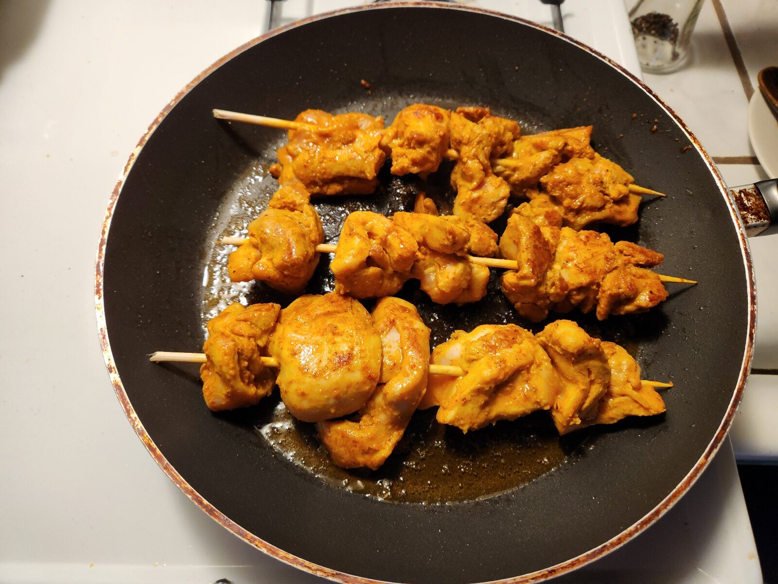 When the skewers have been browned put them back into that baking dish and set aside for a moment.