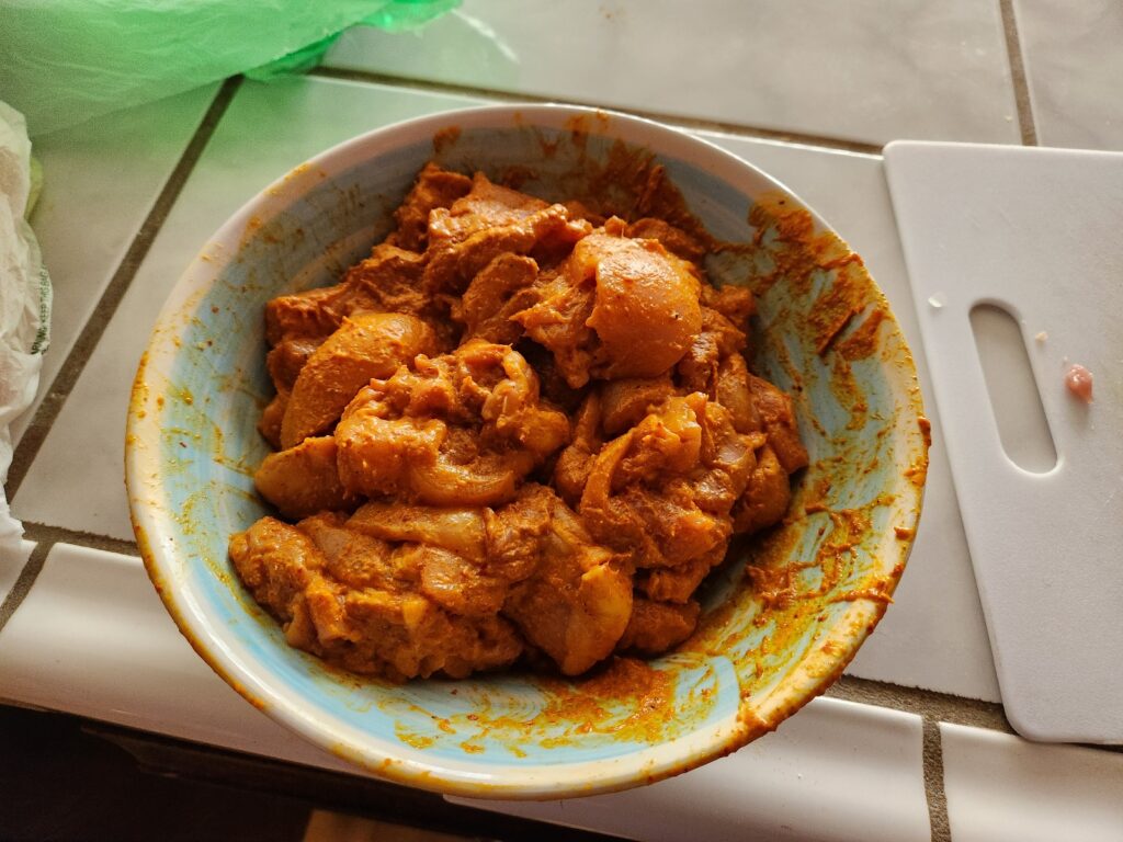 Cut that chicken up and get it in the marinade. I cut into 4-5 inch chunks for proper skewage.