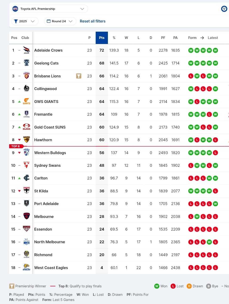 The Final AFL Ladder from last year