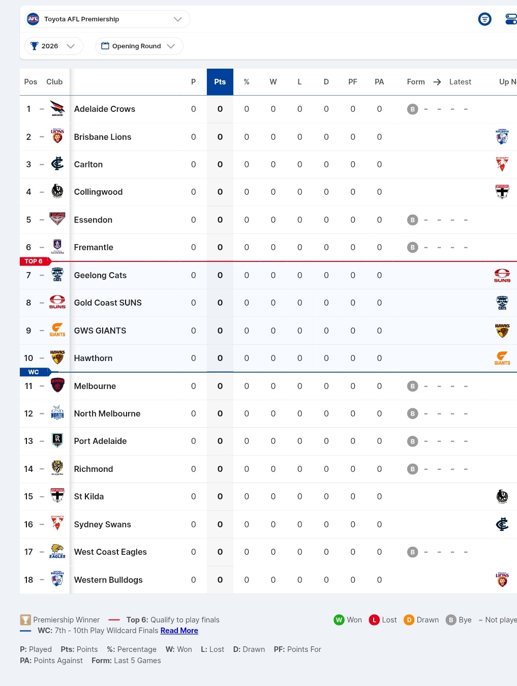AFL Opening Round Standings and Schedule