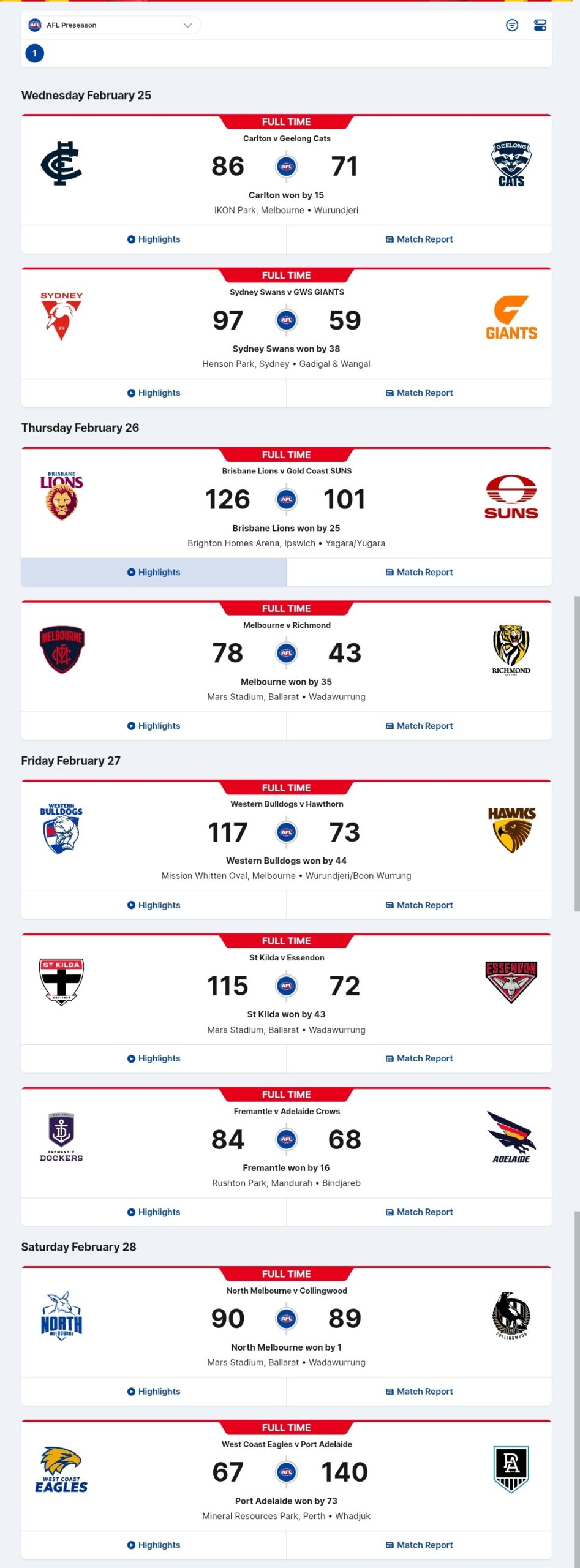The AFL Preseason Results