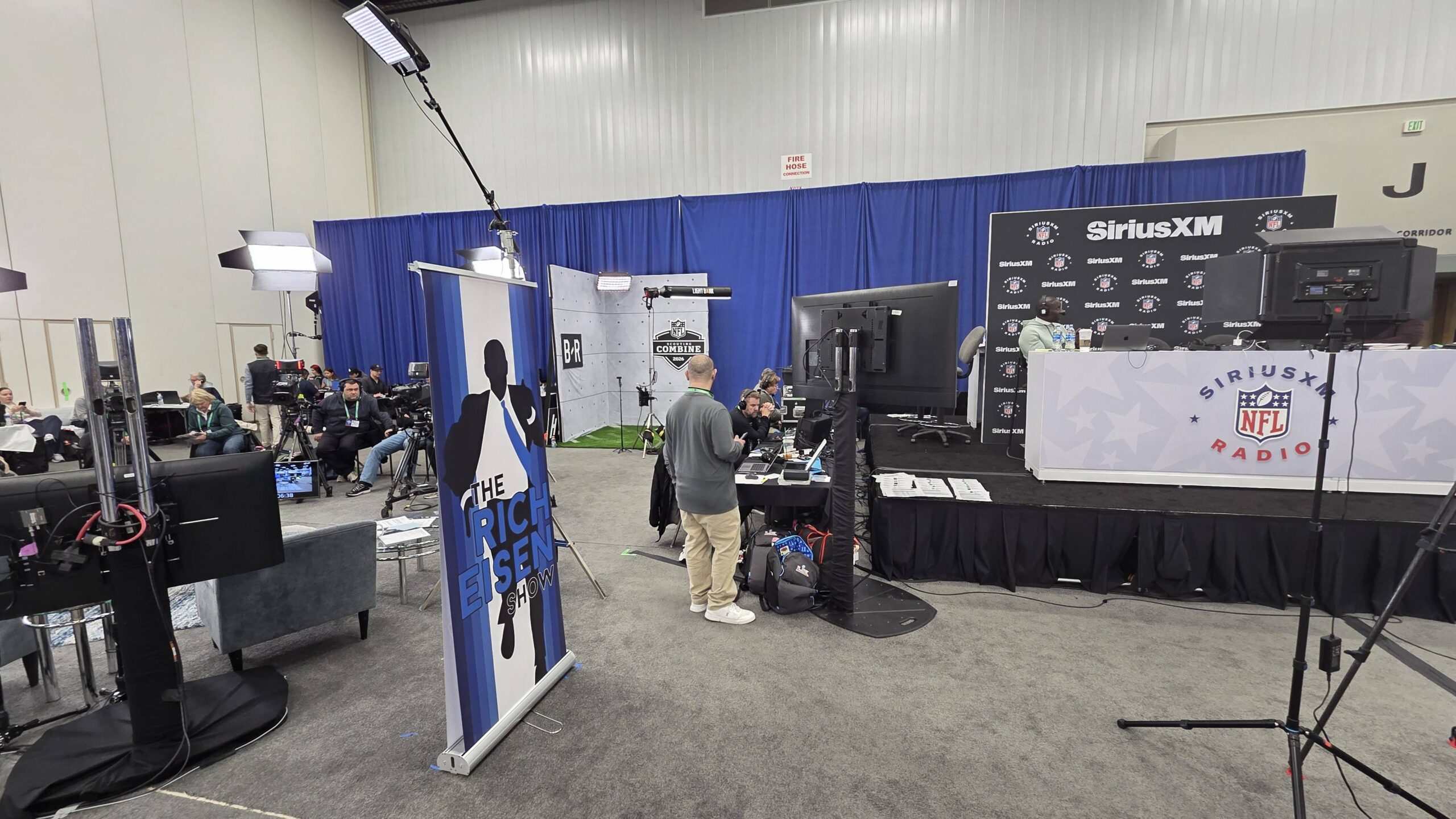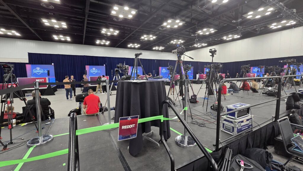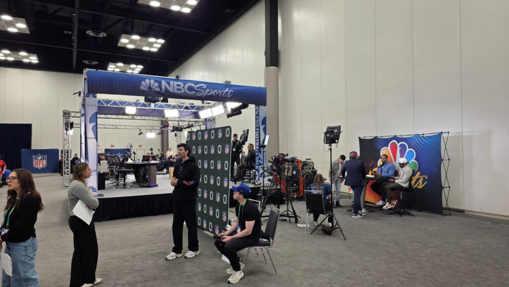 The media hall itself is a stark contrast to the barren and quiet hallways – it’s a swirl of activity, with rivers of athletes and coordinators intermittently punctuated by podiums, desks, cameras and stages. It has two sides: one for smaller players like local news and regional sports outlets, and one for media powerhouses like NBC Sports, The Rich Eisen Show, and Sirius XM.