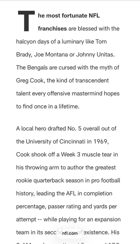 Ken Anderson was a field commander. Boomer Esiason was a leader. Joe Burrow is a playmaker. Greg Cook? Something else. Arm strength and vision.