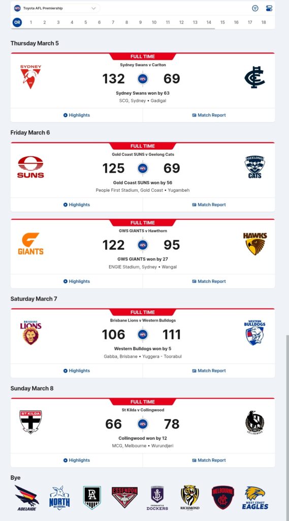The AFL season started this week with the “Opening Round” in which only ten teams participated. That’s okay, though, because the quality of the games was very good. Who needs a preseason? Let’s go!