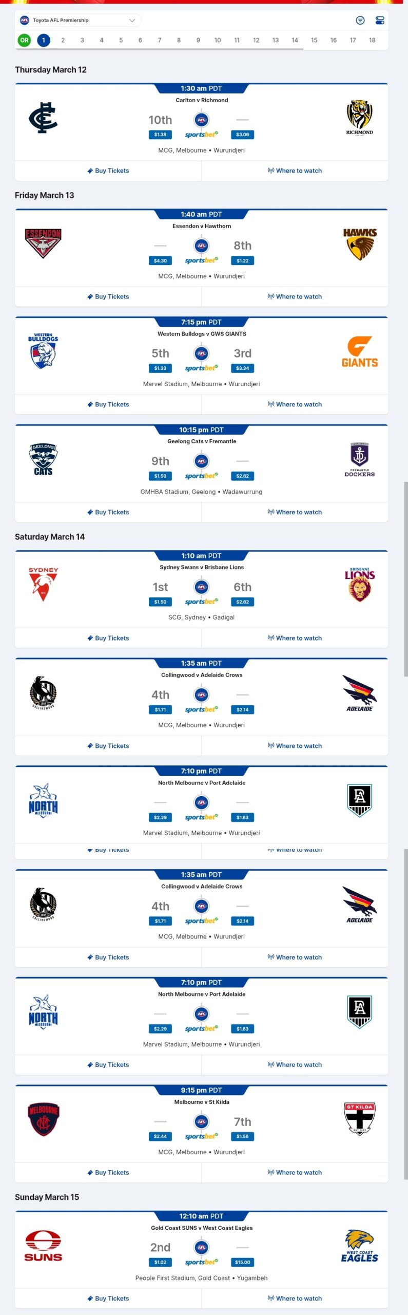 If you are a member of an AFL club or you got a Watch AFL membership, you should be able to watch every AFL and AFLW game, including replays. Game times vary between Australian afternoon and evening, which actually makes it easier for us in North America to watch as the games can be seeing in the evenings on Pacific Time and early mornings on Eastern time.