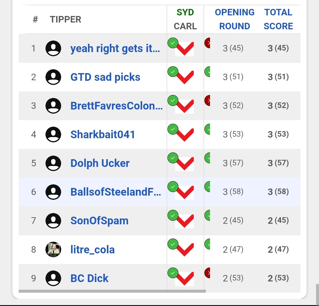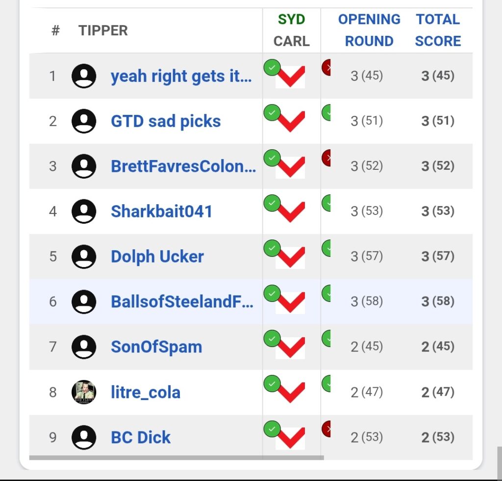 It was a rough week in the AFL Tipping Competition as no one got better than 3 out of 5. We have a full slate of 9 games next week, so we’ll see if the results improve. Don’t forget to put the tips in!