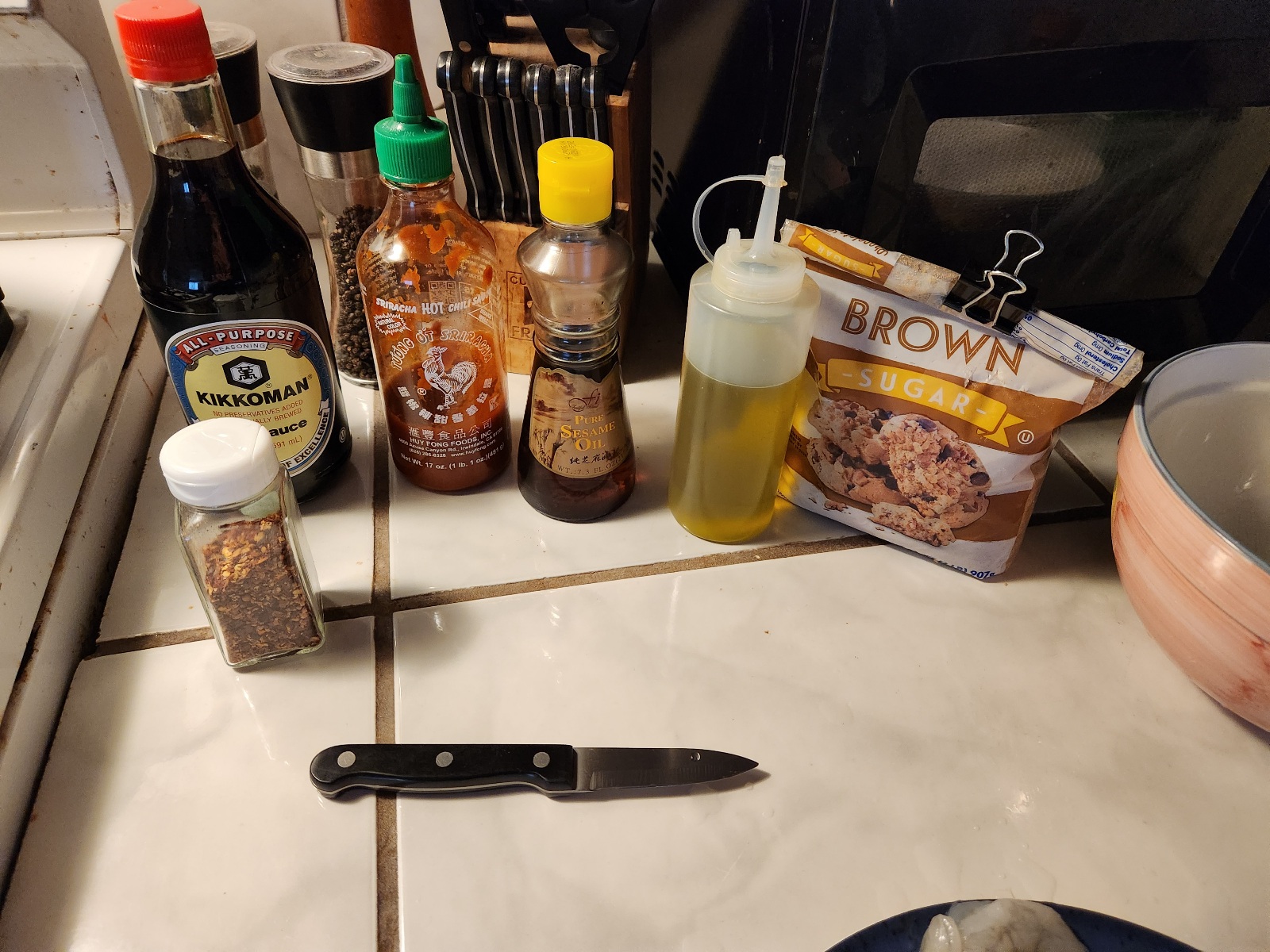 left to right – red pepper flake, soy, black pepper, sriracha, sesame oil, olive oil and brown sugar