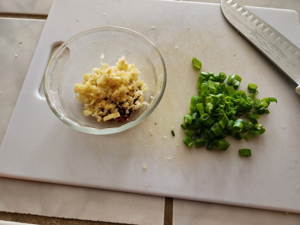 We will start as we usually do by mincing up the ginger and garlic, followed with the chopping of the green onions.