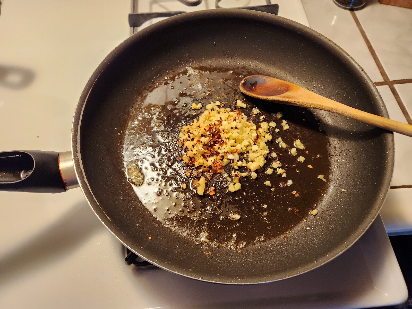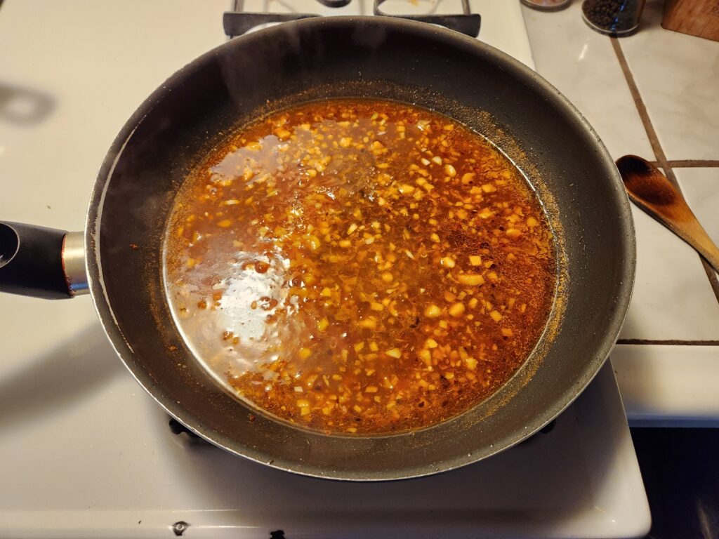 Let the pan cool for a brief bit then, turn the flame up to high. After the skillet/wok has been heated back up, add in the sesame oil. When the oil starts to get a little smoky it’s time to sauté the chili flakes, ginger and garlic until it gets aromatic as a motherfucker.