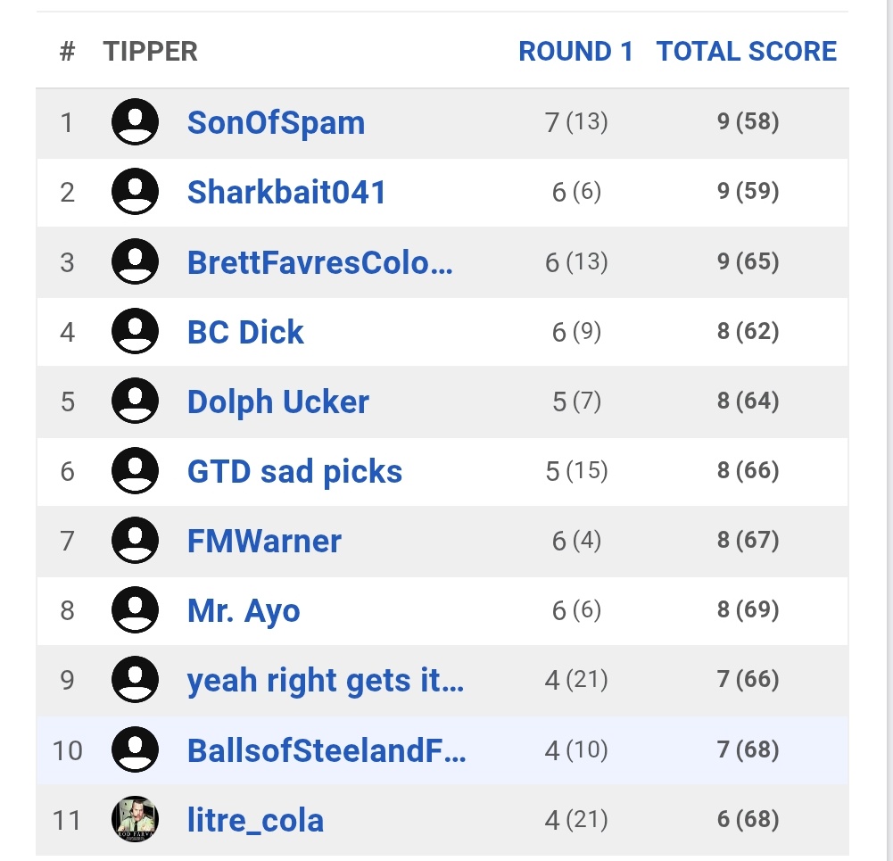 It was a great week for Spammy in the AFL Tipping Competition as he takes over first place. Next week, we have some teams on bye, so it will be another weird week, but we should be back to normal soon. Don’t forget to put the tips in!